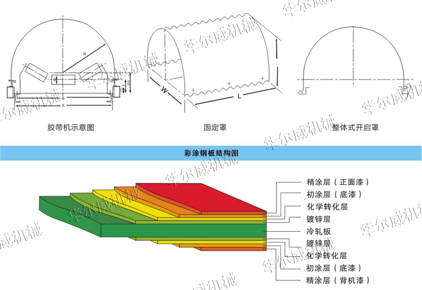 本公司生產(chǎn)的彩鋼板防雨罩適用于各種工況條件下的皮帶機罩殼,DTII、TD75、DJC、QD80型全系列皮帶機彩鋼板防雨罩。適用于B500、B650、B800、B1000、B1200、B1400、B1600、B1800、B2000等系列皮帶機,大致分為固定罩、開啟罩、跑偏開關罩三類。顏色天藍色、海藍色等。量大可以訂制特殊顏色。廣泛適用于電廠、水泥廠、煤礦等各大廠礦企業(yè)的輸送帶的防雨、防塵、防風,貨物在傳送過程中減少損失,使輸送帶在運行中更為可靠,區(qū)別于傳統(tǒng)彩鋼板防護,對凈化環(huán)境起到很大的作用。有固定式、開啟式還有帶觀察窗,可以看到物質(zhì)在傳送過程中及傳送帶運行是否正常,更有跑偏罩,為設有跑偏開關的輸送機起到防雨、防塵等作用。